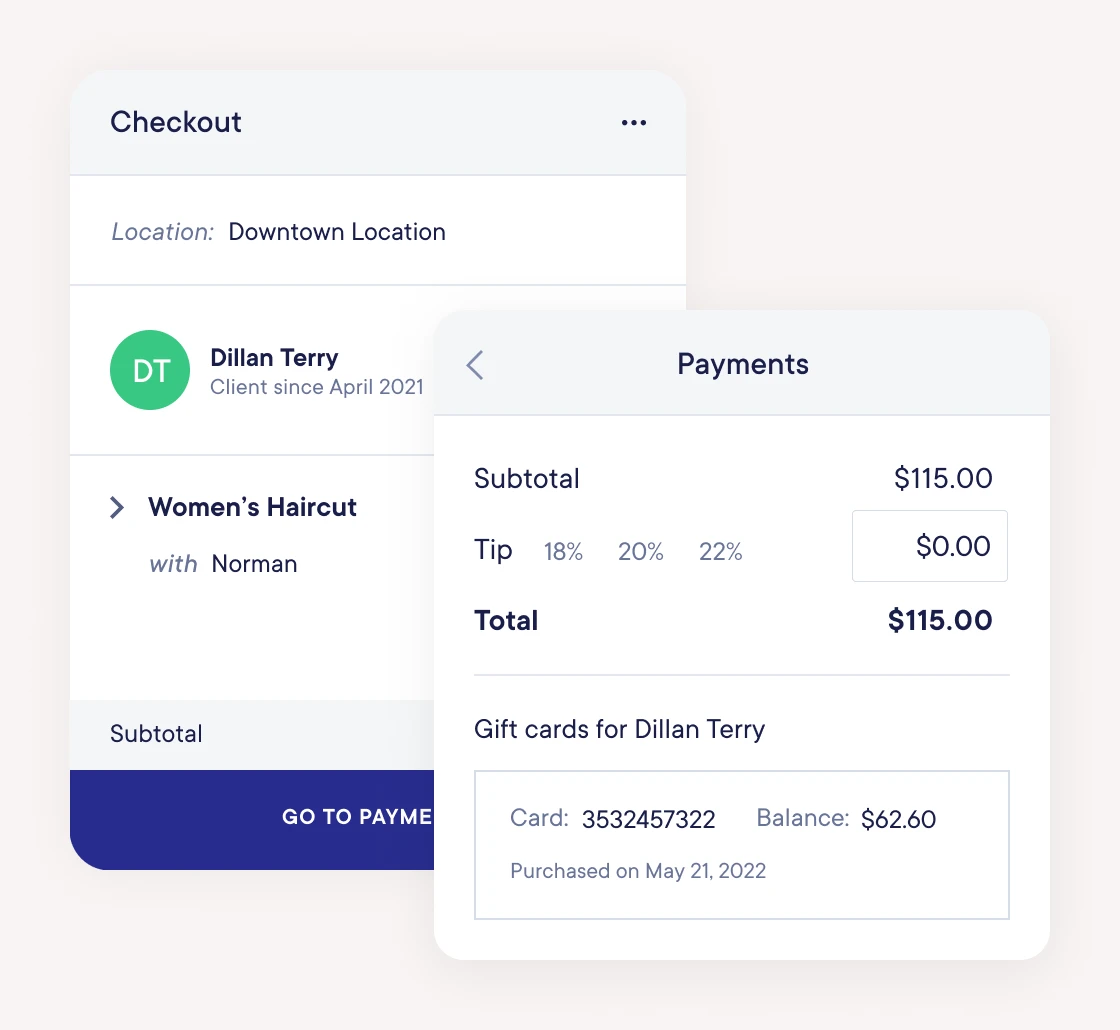 Your clients' gift cards can be viewed within the checkout process and can even be used without the physical gift card present.
