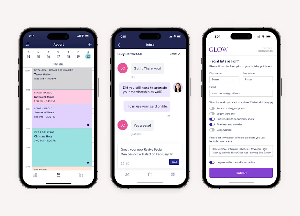 Mangomint offers solutions to help you automate taking appointment requests over the phone, following up with clients, and checking people in (and more).