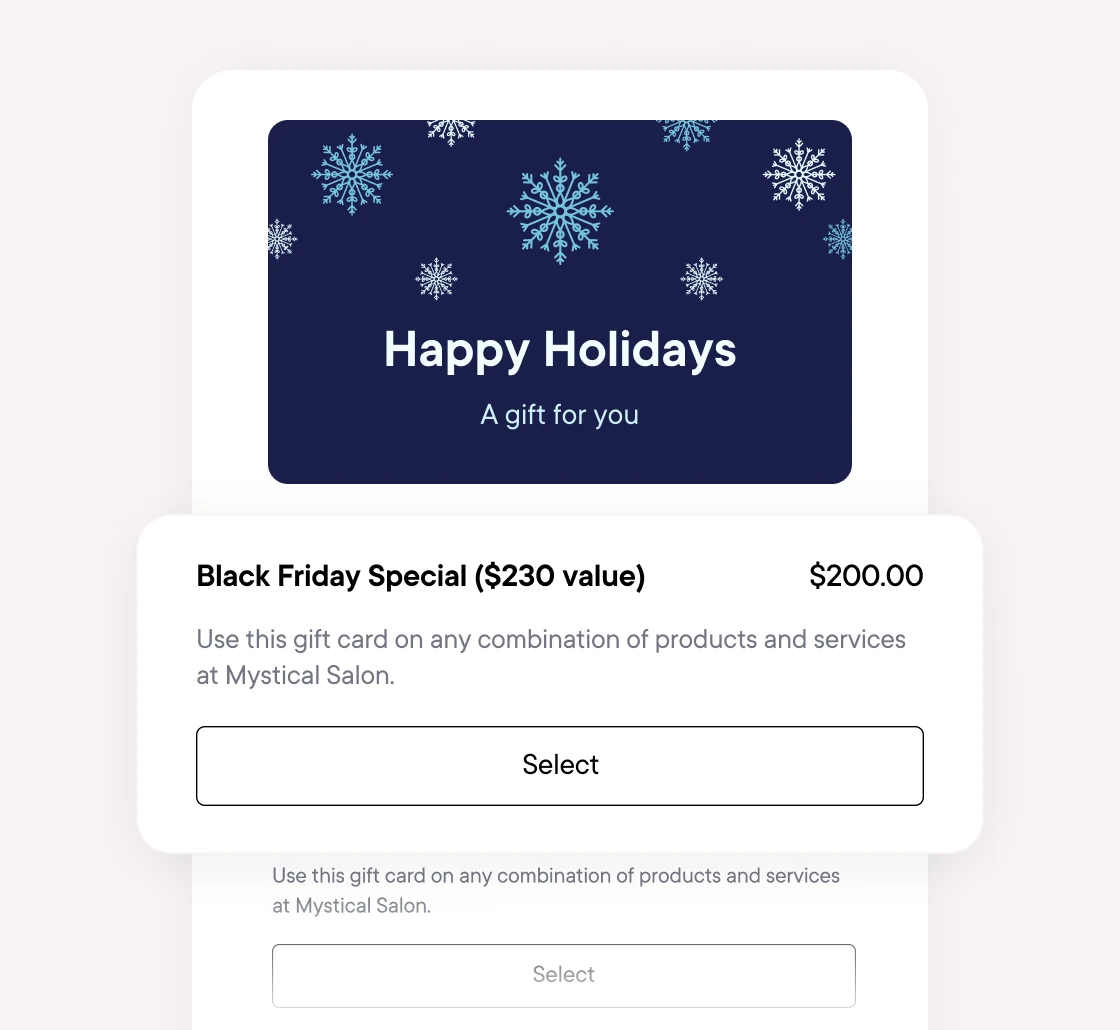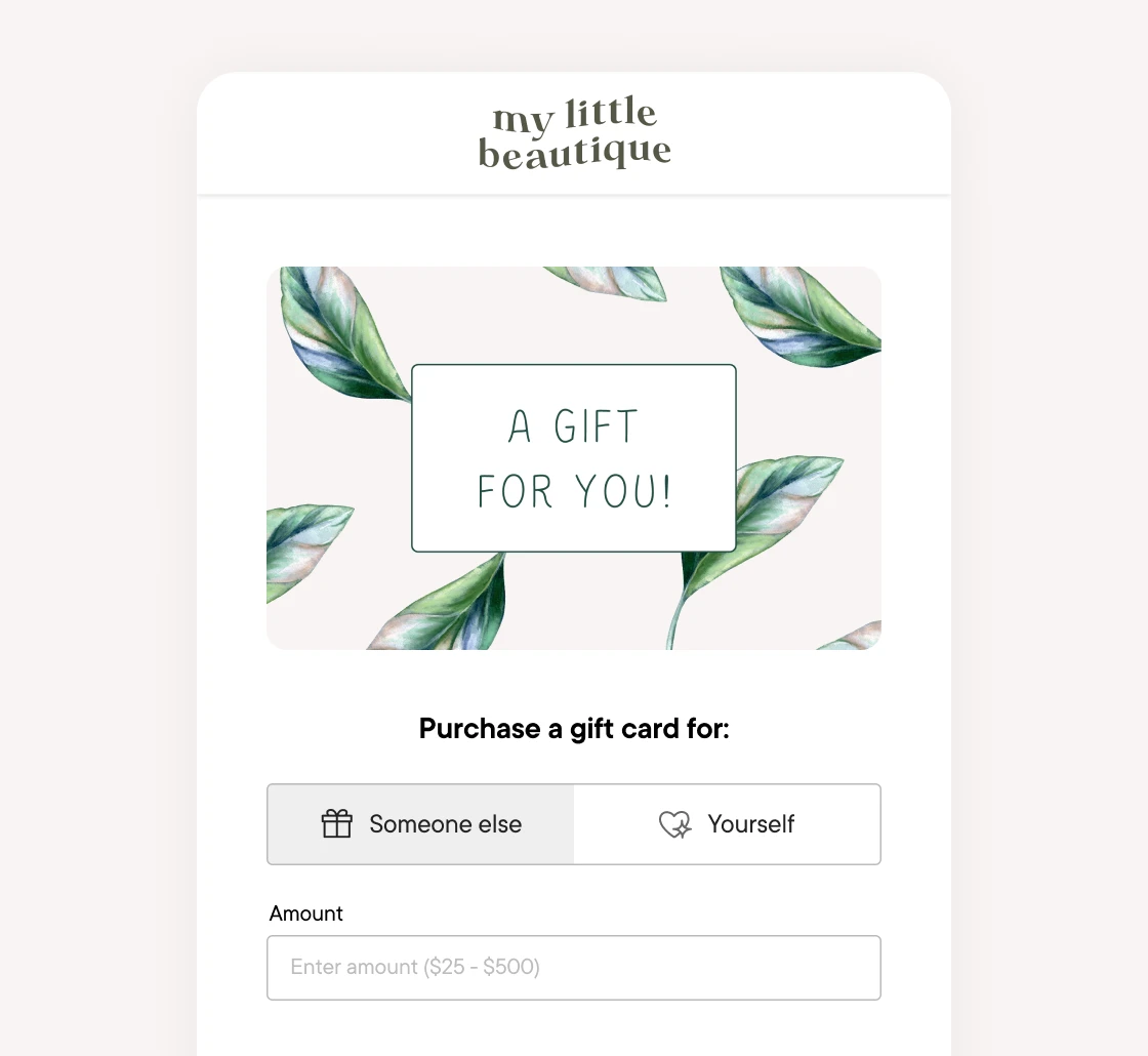 Sell branded gift cards with custom amounts directly on your website and online booking.
