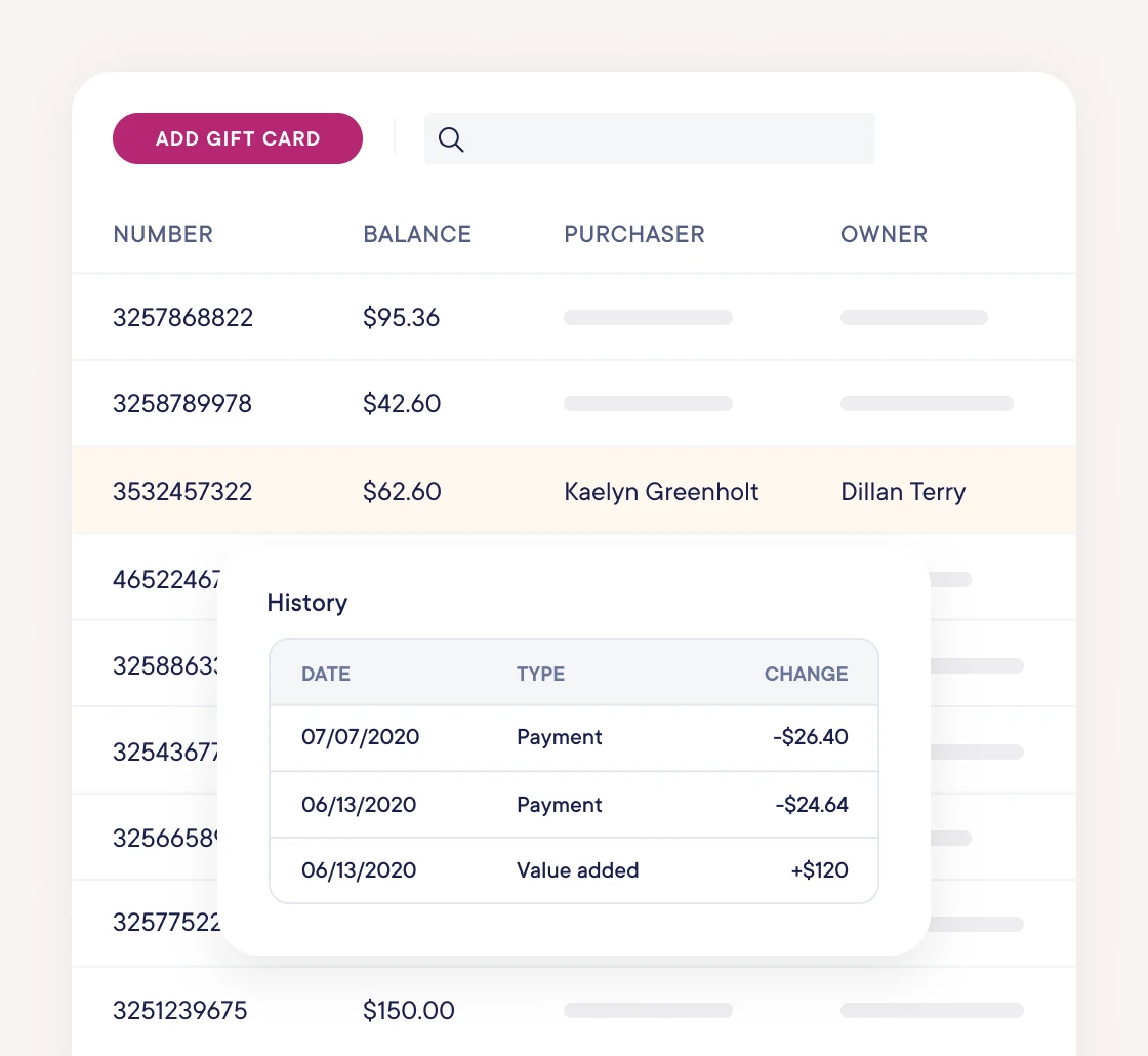 Assign "purchasers" and "owners" to each gift card to ensure that the balance is synced to the correct client account for later use.