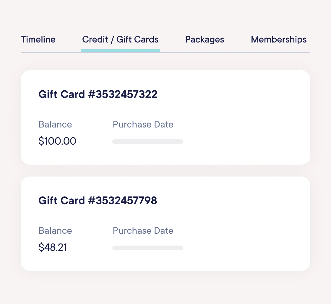When you create or sell a new gift card it gets automatically synced to the associated client's profile under their credit/gift cards tab.